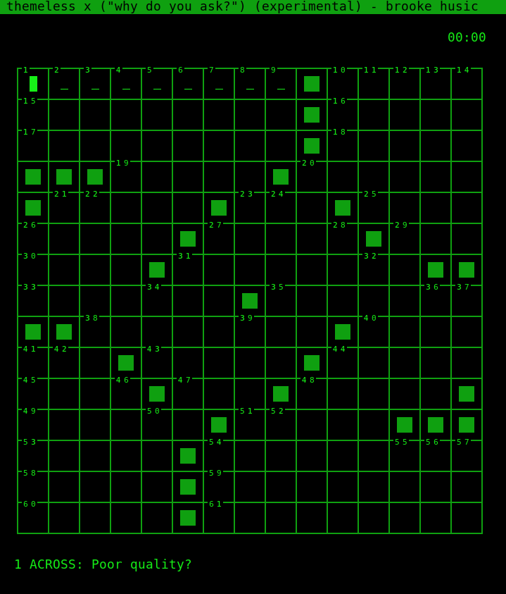 Cursewords is a full-featured Python terminal client for opening and solving crosswords puzzles, originally developed for my personal use on Linux. Its downs-only mode was featured in a Wall Street Journal article on that solving constraint, and I was interviewed for Beyond Wordplay about it. Ross and I use Cursewords to solve puzzles on our Twitch stream, Cursewords Live.